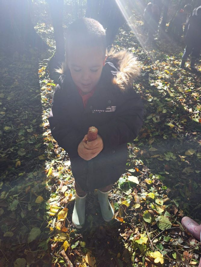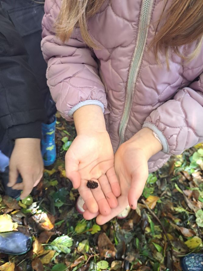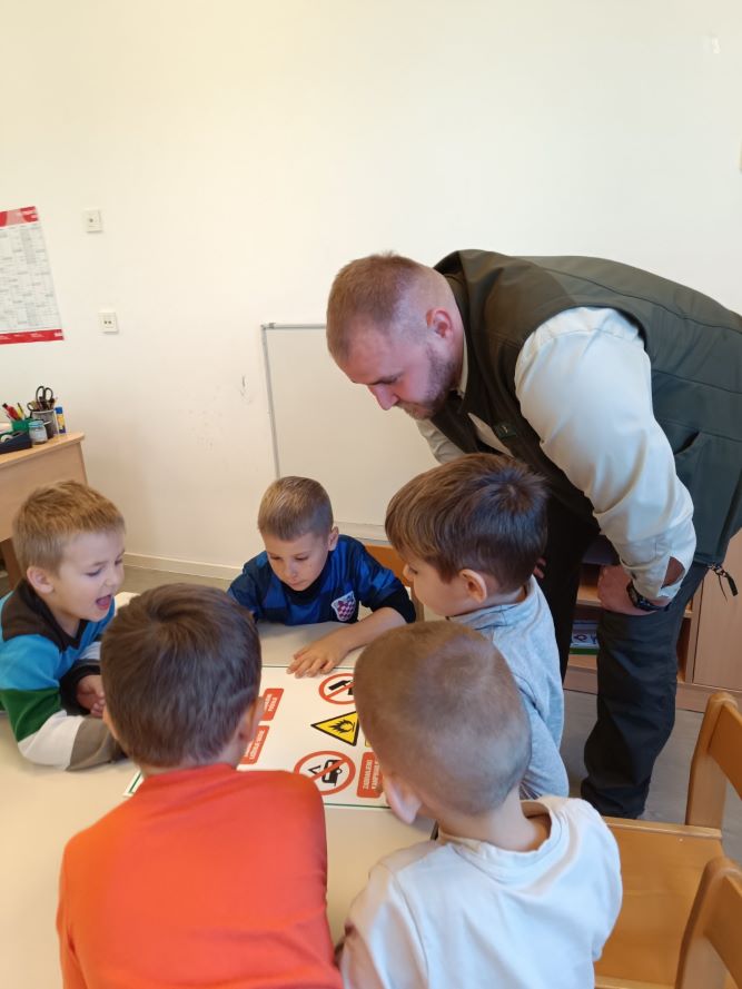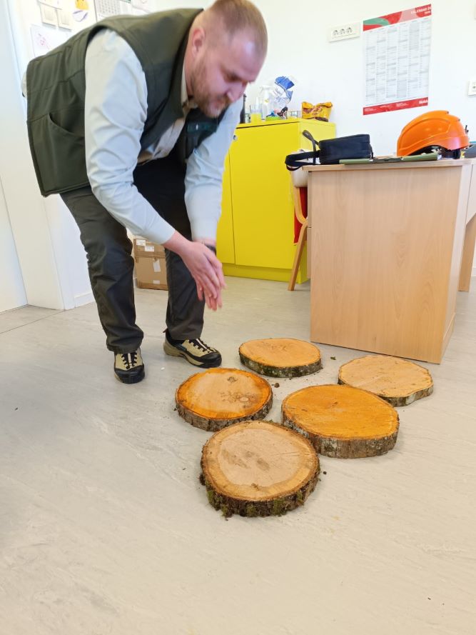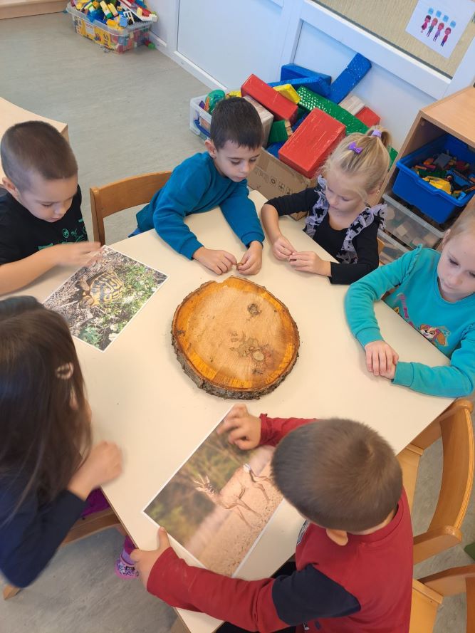 Nekoliko dana kasnije, naš vrtić posjetio je i revirnik Tomislav Topolovčan iz Hrvatskih šuma. Donio je oblutke raznih stabala kako bi djeca mogla izbliza vidjeti godove i naučiti što oni govore o starosti stabla i uvjetima u kojima je raslo. Djeca su s velikim zanimanjem promatrala drvo, uspoređivala različite vrste i postavljala brojna pitanja. Šumar je govorio i o pravilima ponašanja u šumi, o važnosti očuvanja prirode te o šumskim životinjama koje tamo žive. Susret je bio vrlo poučan i zanimljiv, a djeca su kroz igru i istraživanje naučila koliko je važno čuvati našu šumu i sve njezine stanovnike. Ovi šumski dani bili su ispunjeni dječjom znatiželjom, otkrićima i novim iskustvima koje će dugo pamtiti.