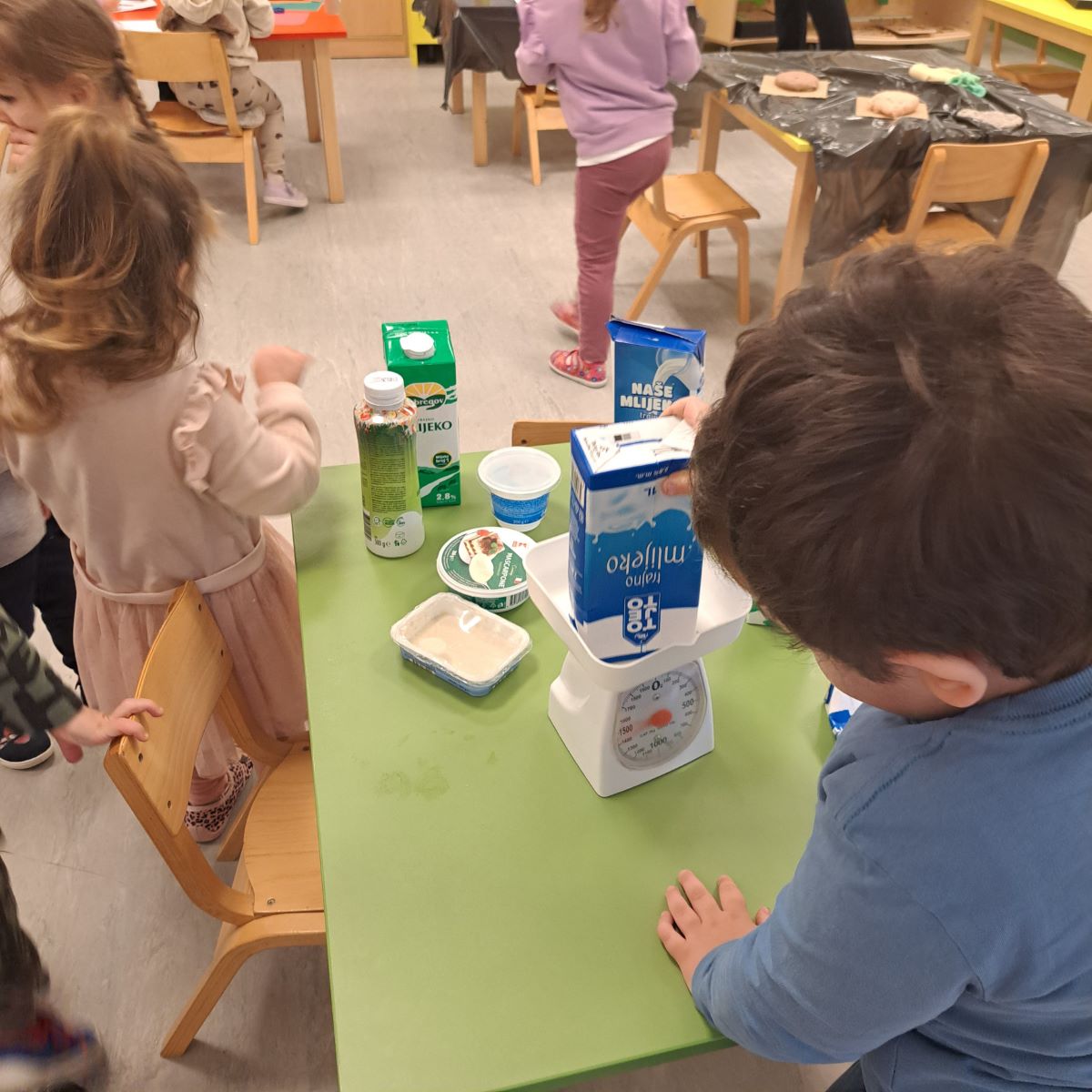 Od svih ponuđenih aktivnosti najveći interes izazvao je pokušaj mužnje – naravno, ne prave krave, nego osmišljene improvizacije koje su djeci omogućile da na zabavan i siguran način dožive kako taj proces izgleda. Uz puno smijeha, strpljenja i pokušaja, mali istraživači su s velikim oduševljenjem sudjelovali u ovoj aktivnosti.
